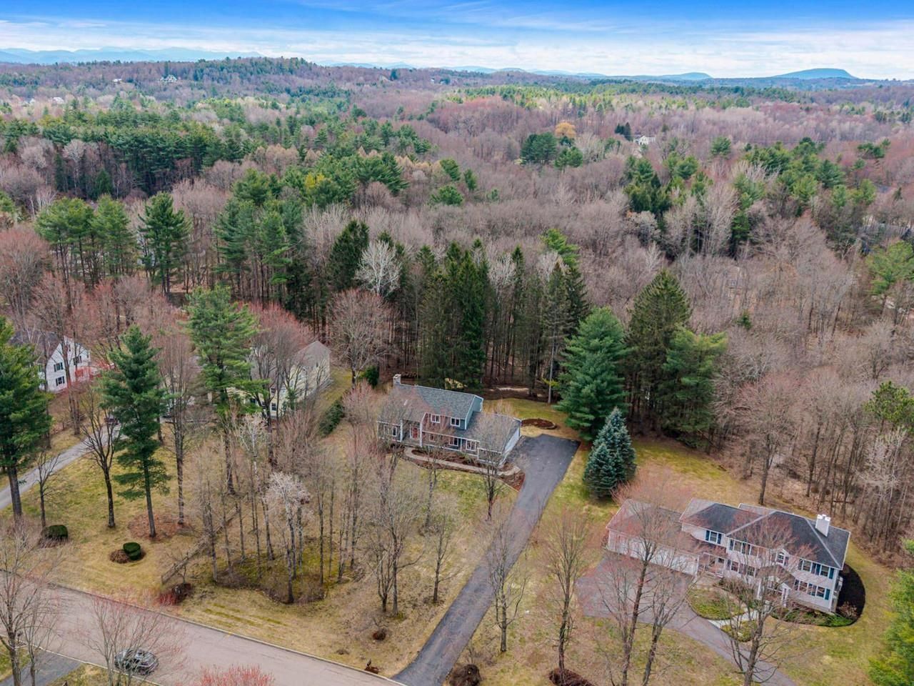 This gracious contemporary home is nestled in one of Shelburne's most sought-after neighborhoods, set back from the road on a private three-quarter-acre lot. With over 3,500 square feet of finished living space across three floors and a walk-out lower level, this home offers plenty of room to live, work, and entertain! Architectural details throughout include vaulted ceilings, a tray ceiling in the primary suite, and an expansive, updated wood deck overlooking the large private backyard. The sunken family room is anchored by a striking stone hearth fireplace. The eat-in kitchen has been thoughtfully updated over the years with custom red birch cabinetry, premium granite countertops, top-of-the-line stainless-steel appliances, and new lighting. A large dining room and formal living room are off the maintenance, with a private office tucked off the mudroom zone. The spacious primary suite features a beautifully updated bathroom and large walk-in closet. The finished lower-level features abundant natural light, two finished spaces with a wood stove, a full bathroom, and generous storage. The oversized garage was recently insulated and heating was installed. Other recent upgrades are a smart lighting system, Ring security cameras, a cell phone signal booster. Hardwood floors have been refinished throughout, and numerous additional improvements have been made outside. This meticulously maintained home on a large lot is in a premier Shelburne location.
